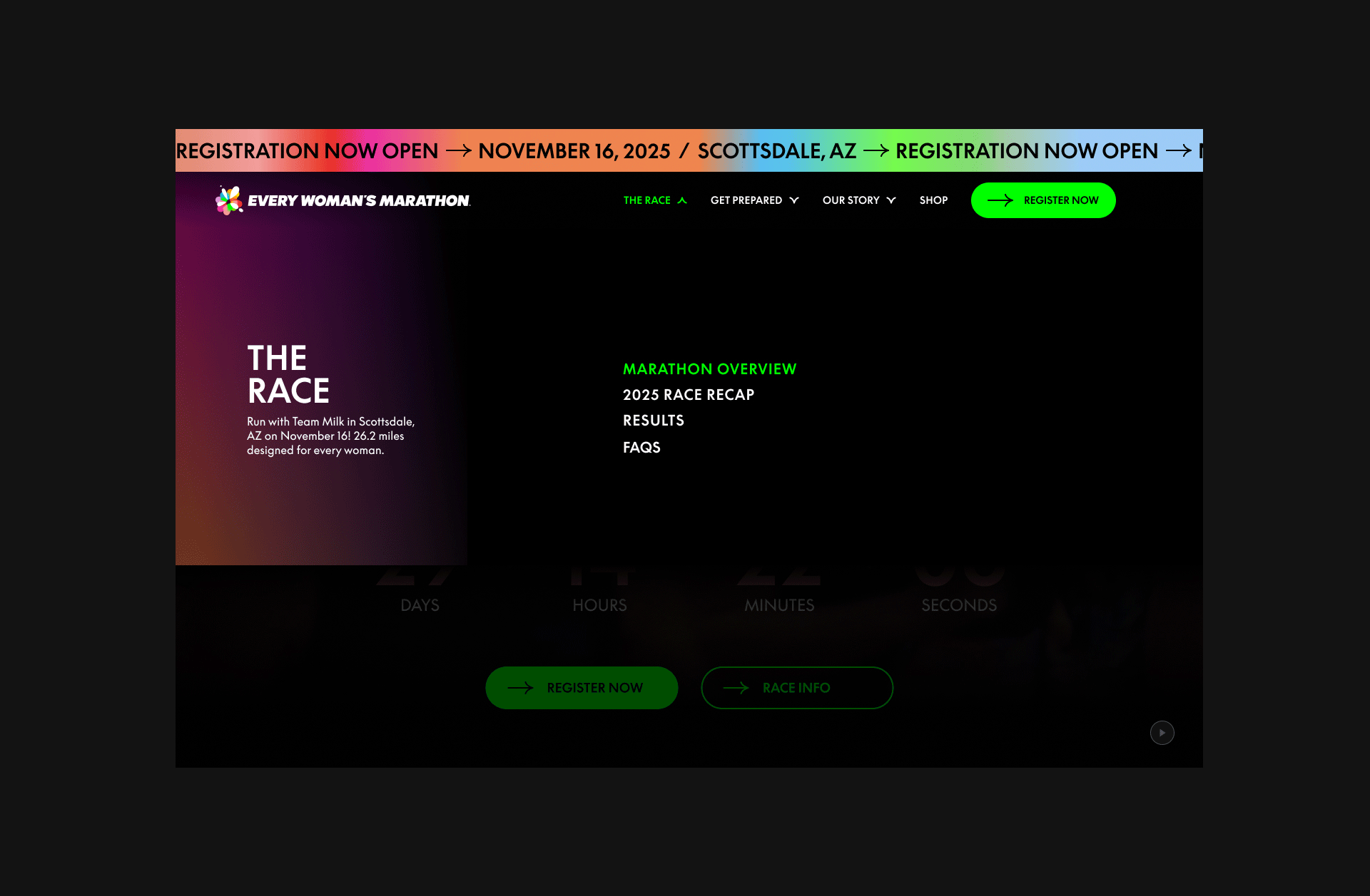 My contributions helped expand the brand beyond the inaugural launch into a full functioning marathon. The website went from a beautiful shell encouraging sign-ups to a trustworthy race weekend hub and training/nutrition resource.